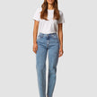 The white T-shirt offers a fresh and effortless base, while the light blue jeans add a casual vibe with classic denim appeal. Perfect for a day on the go, where comfort and style go hand in hand – and easy to style with a blazer or accessories for a more personal touch.