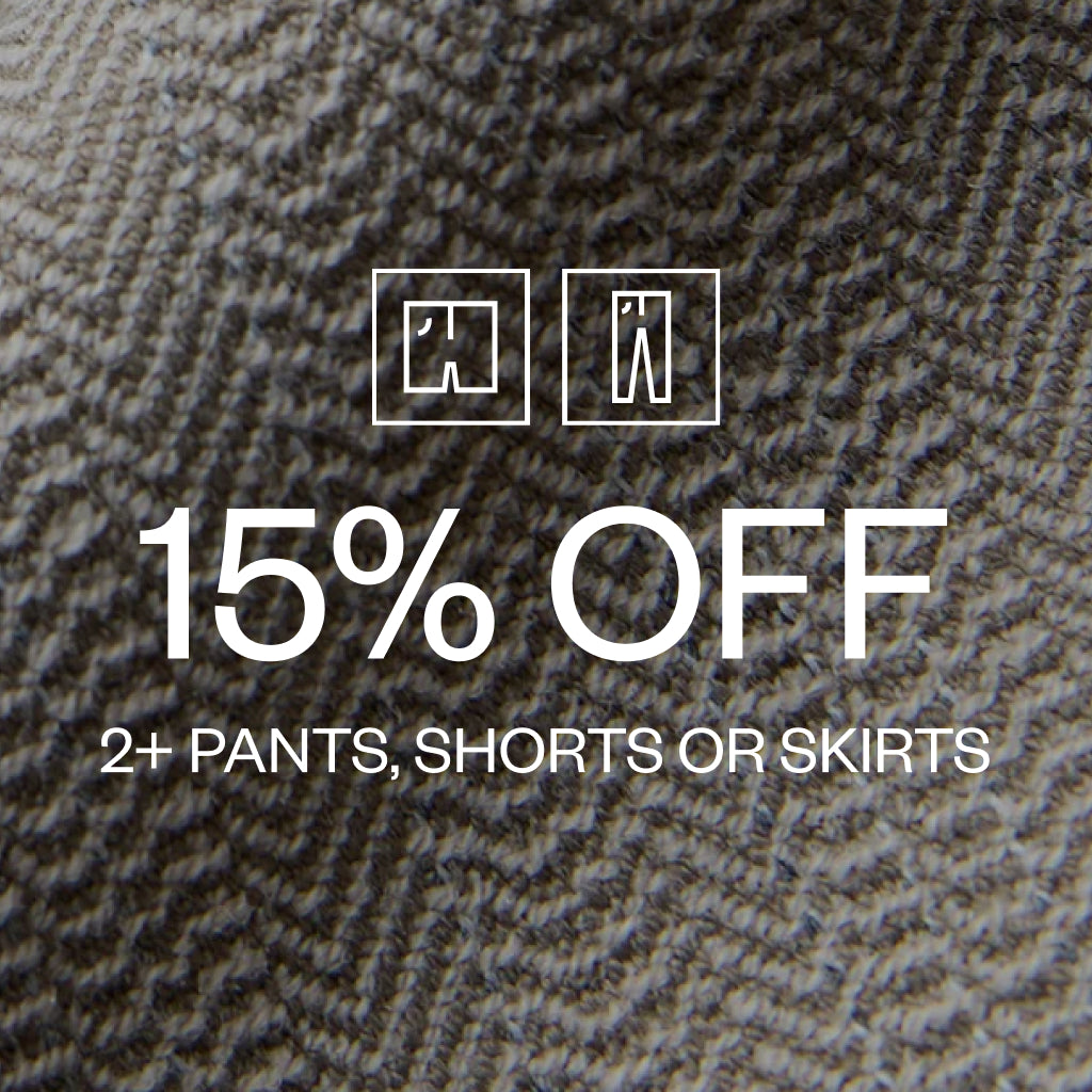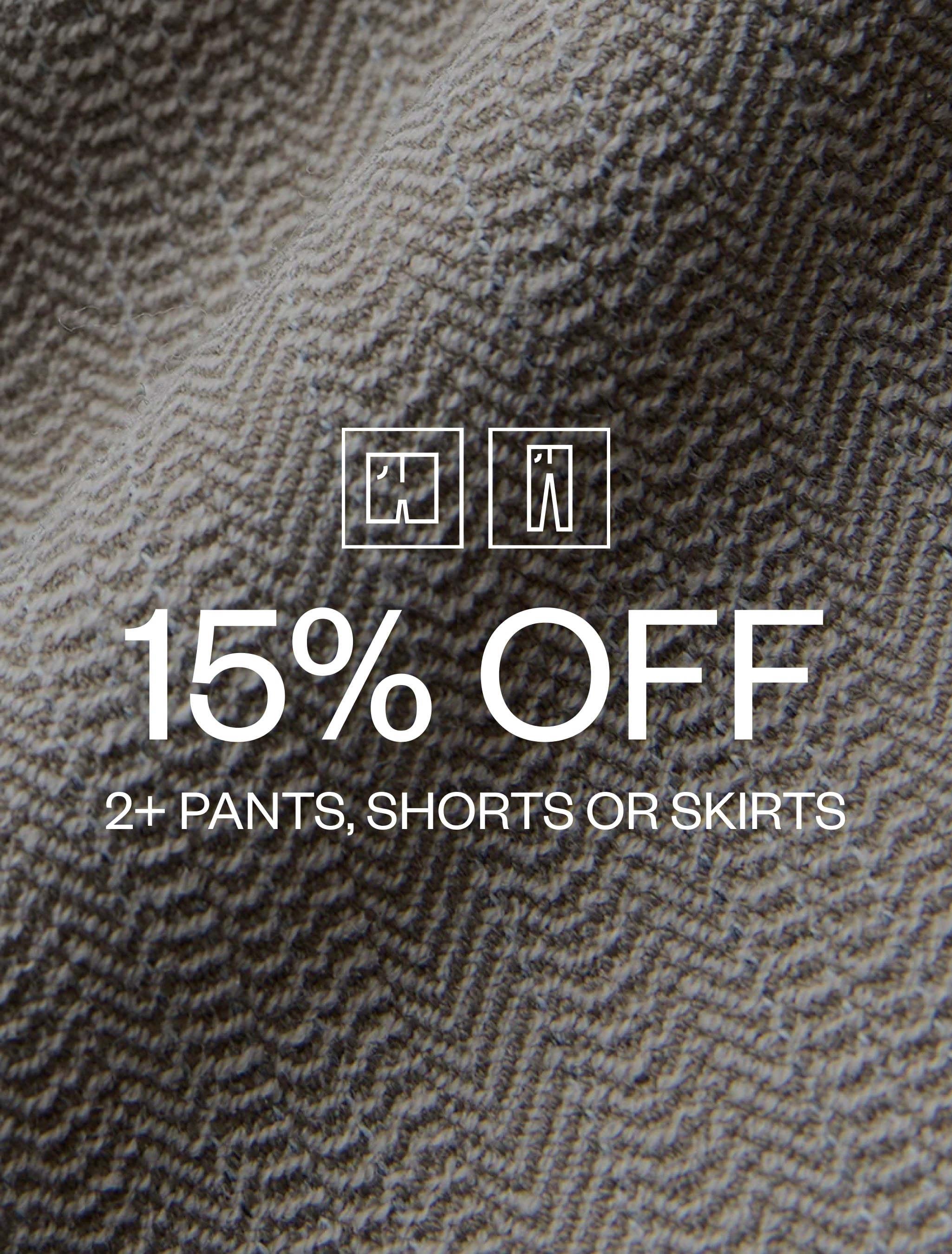 Save 15% when you buy two or more pairs of pants, shorts or skirts! The perfect occasion to stock up on your favorites or try a new style. For a short time only.