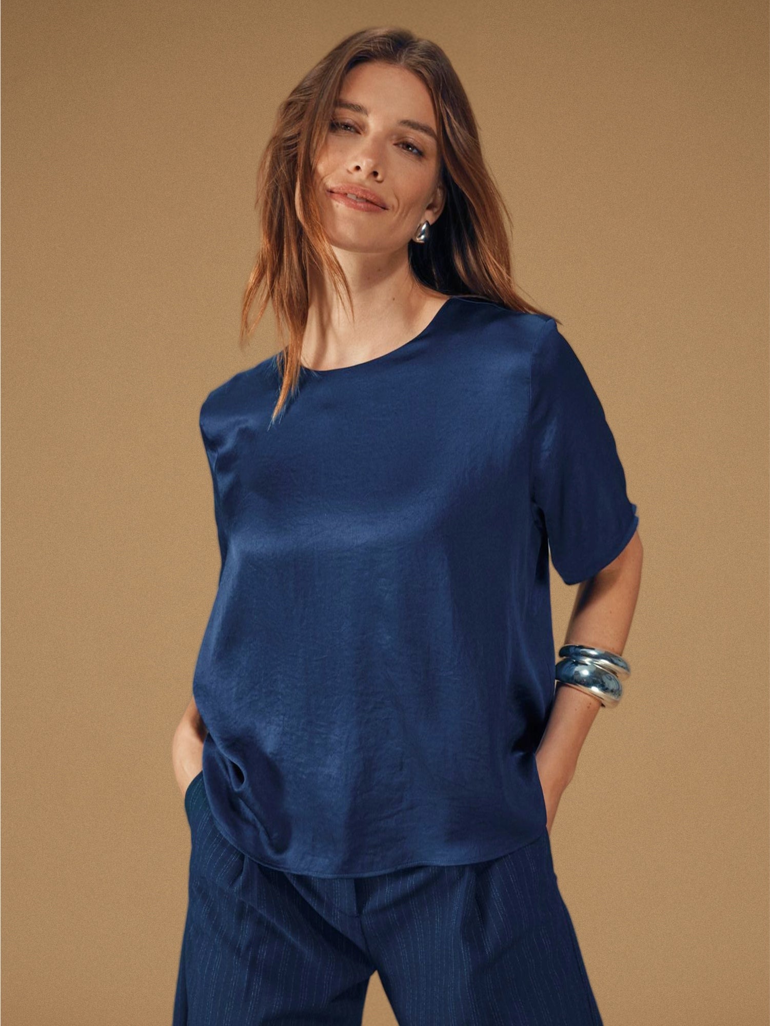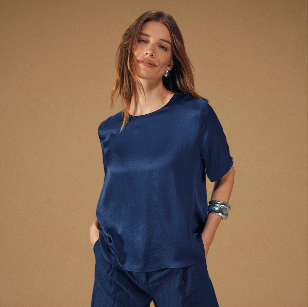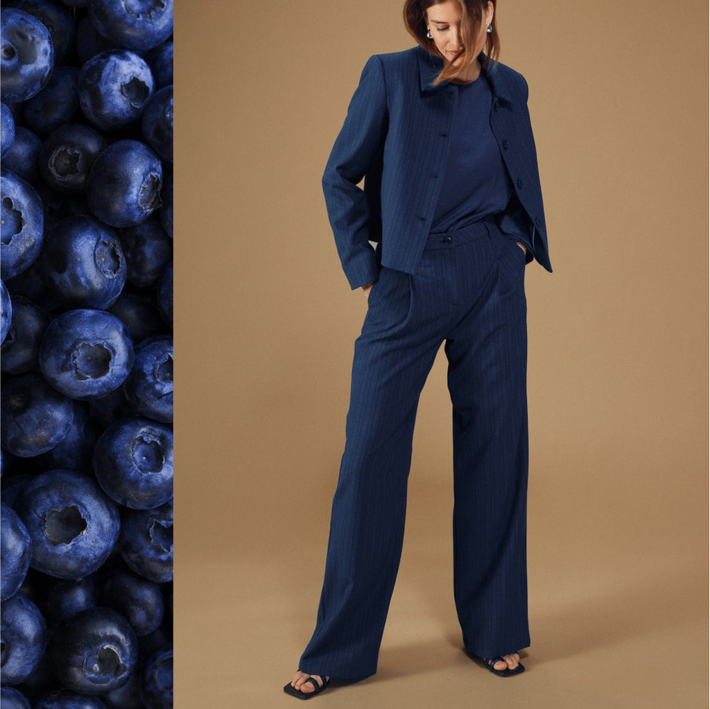 Need a polished outfit for winter events? The Avira Blazer and matching wide-leg Avira Pants are made in a smooth, slightly shiny fabric that catches the light beautifully. Paired with a soft blouse like the Vienna or Amara, you have a complete winter look that balances elegance and comfort.