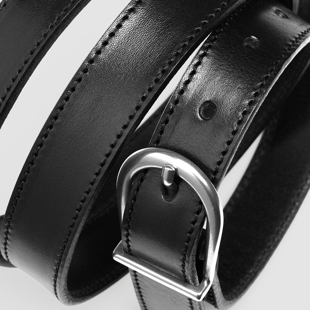 The Thin Leather Belt is crafted from 100% leather with a buckle in either silver or gold.
